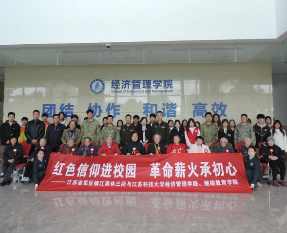 秋阳和煦,菊灿桂香。在重阳佳节来临之际,10月21日,由继续教育学院、经济管理学院与江苏省军区镇江第三离职干部休养所联合主办的“红色信仰进校园,革命薪火承初心”主题活动温情启幕。一场跨越时空的“青春”与“皓首”的对话,在此生动上演。与会人员包括江苏省军区镇江第三离职干部休养所政治委员罗优和干休所老干部们,经济管理学院党委书记尹洁、副院长叶涛锋,以及经济管理学院、继续教育学院的教师和本科生、研究生、留学生代表。