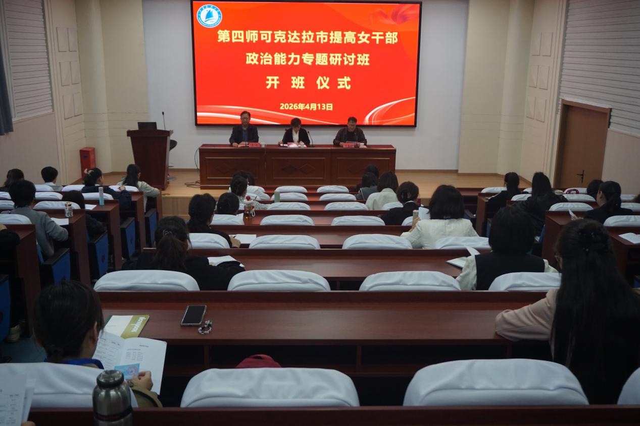 4月13日上午,新疆第四师可克达拉市提高女干部政治能力专题研讨班在我校梦溪校区顺利开班。第四师可克达拉市党委社会工作部三级调研员、师市妇联副主席热娜・吾图克出席开班仪式。
