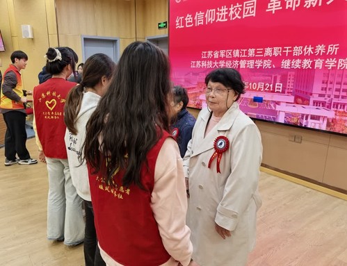 秋阳和煦,菊灿桂香。在重阳佳节来临之际,10月21日,由继续教育学院、经济管理学院与江苏省军区镇江第三离职干部休养所联合主办的“红色信仰进校园,革命薪火承初心”主题活动温情启幕。一场跨越时空的“青春”与“皓首”的对话,在此生动上演。与会人员包括江苏省军区镇江第三离职干部休养所政治委员罗优和干休所老干部们,经济管理学院党委书记尹洁、副院长叶涛锋,以及经济管理学院、继续教育学院的教师和本科生、研究生、留学生代表。 青春邀约,在时代脉搏中感知国家新貌 上午十时,校园门口已满是青春的朝气与期盼。当干休所的老革命、老前辈们抵达时,身着志愿者马甲的学生们立刻迎上前去。一双双青春的手,稳稳地搀扶住历经沧桑的臂膀,这不仅仅是简单的“一对一”结对,更是一次无声的承诺与精神的接力。